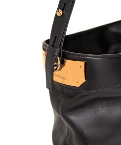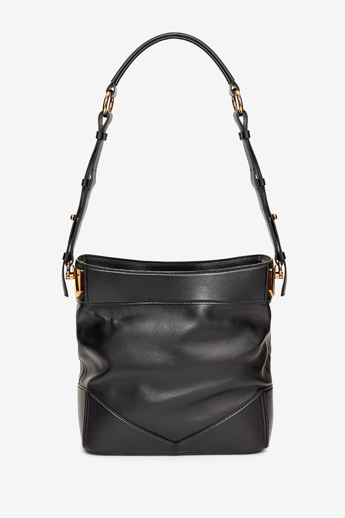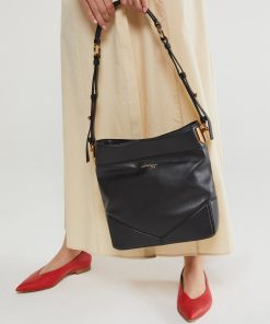 Leather bucket bag with adjustable shoulder strap. Interior with two compartments and side pocket with zip closure. Gold finish.Dimensions: 26.6x27x12 Length of shoulder strap: 33 cm