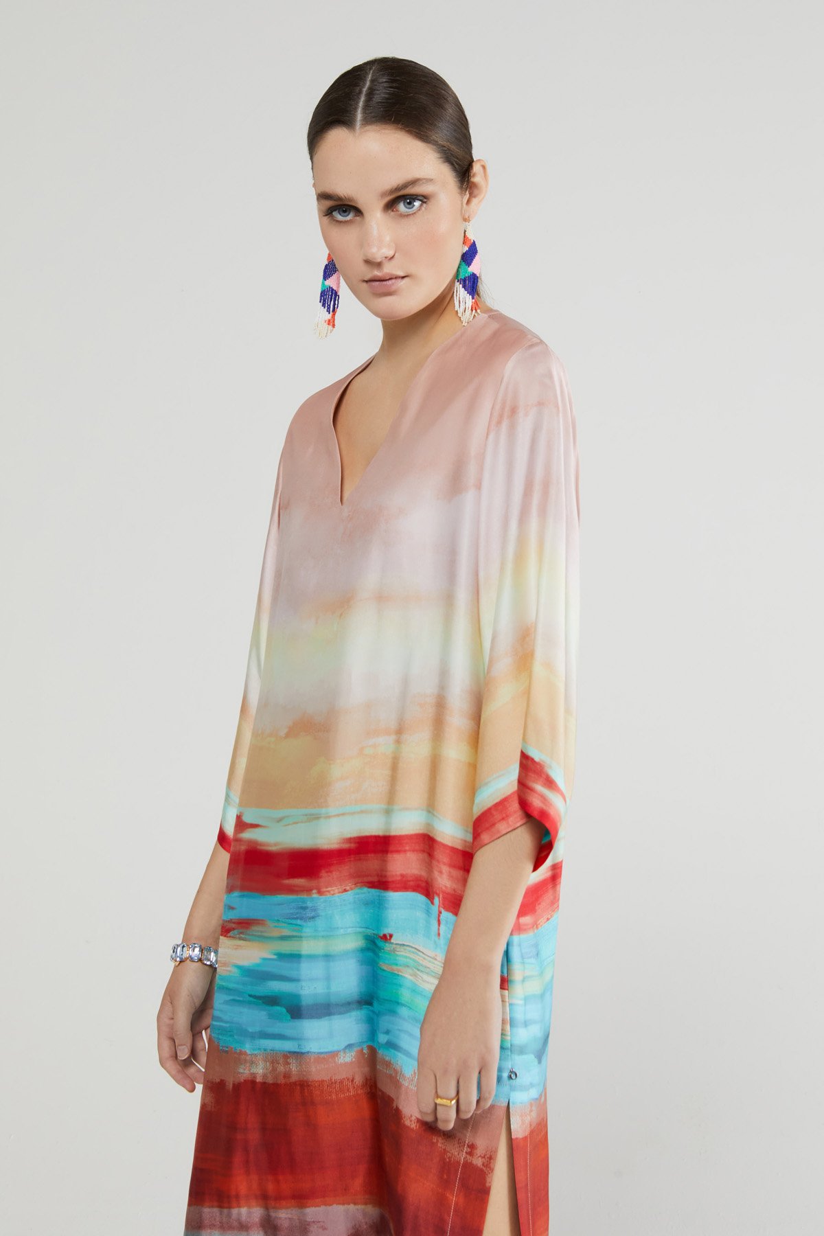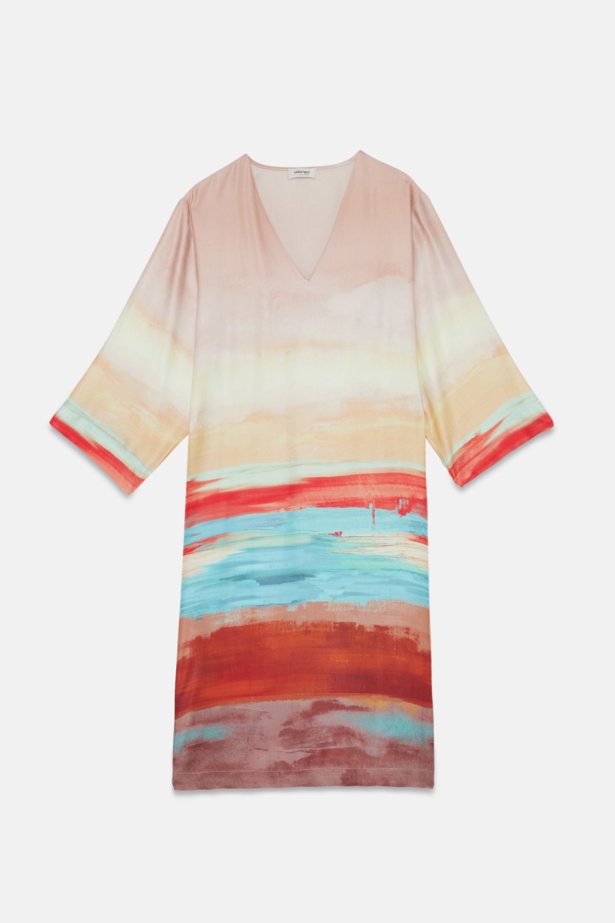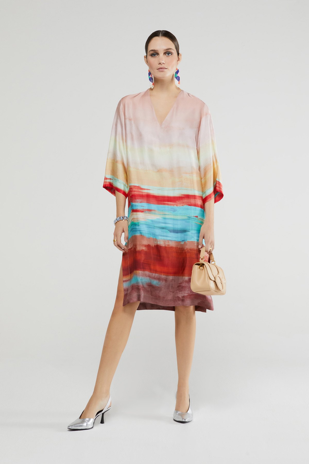 Fluid 100% printed viscose midi dress with V neckline and slits