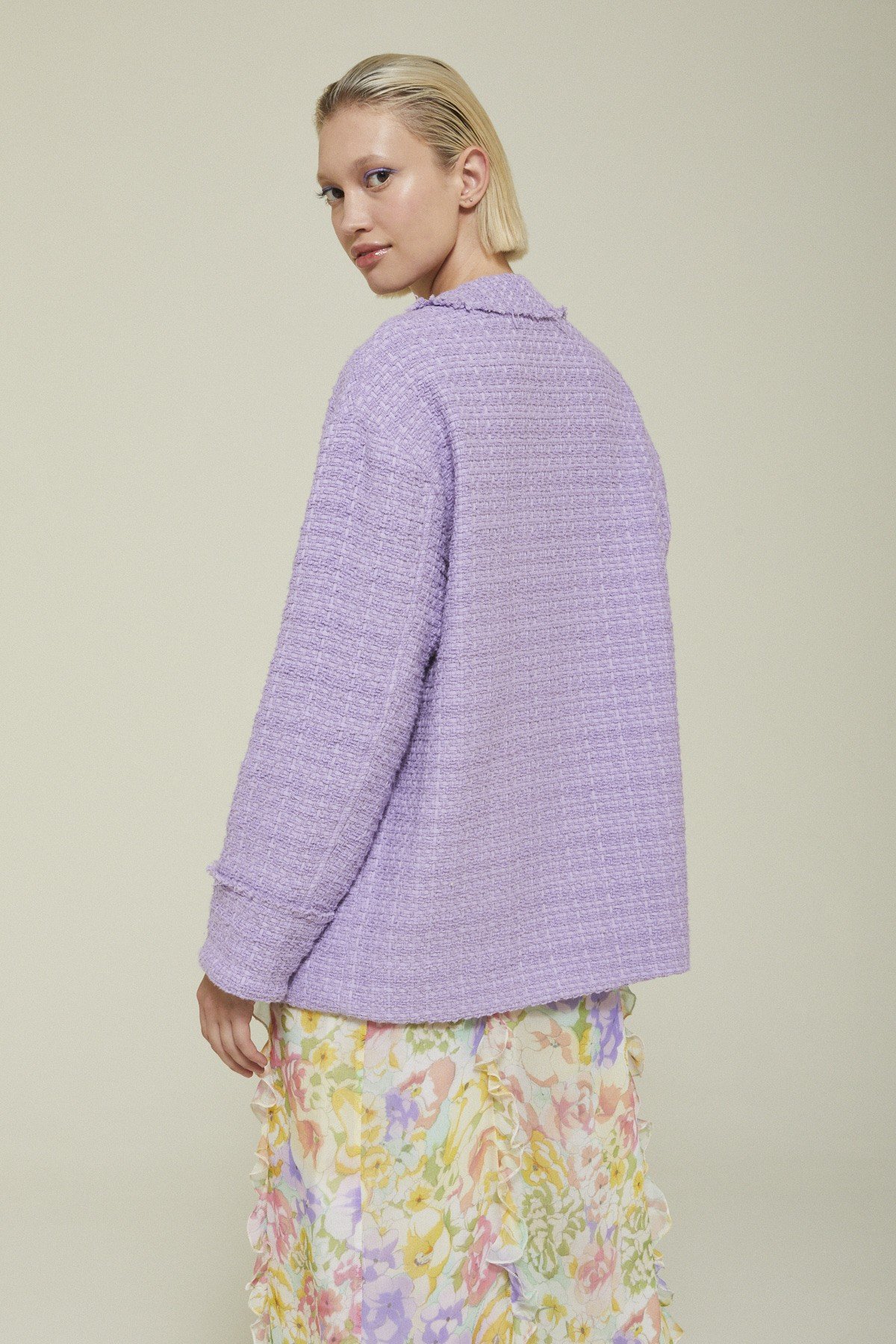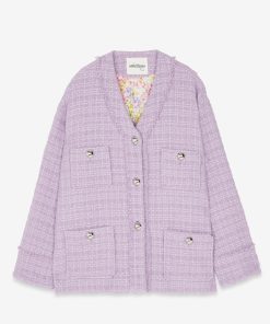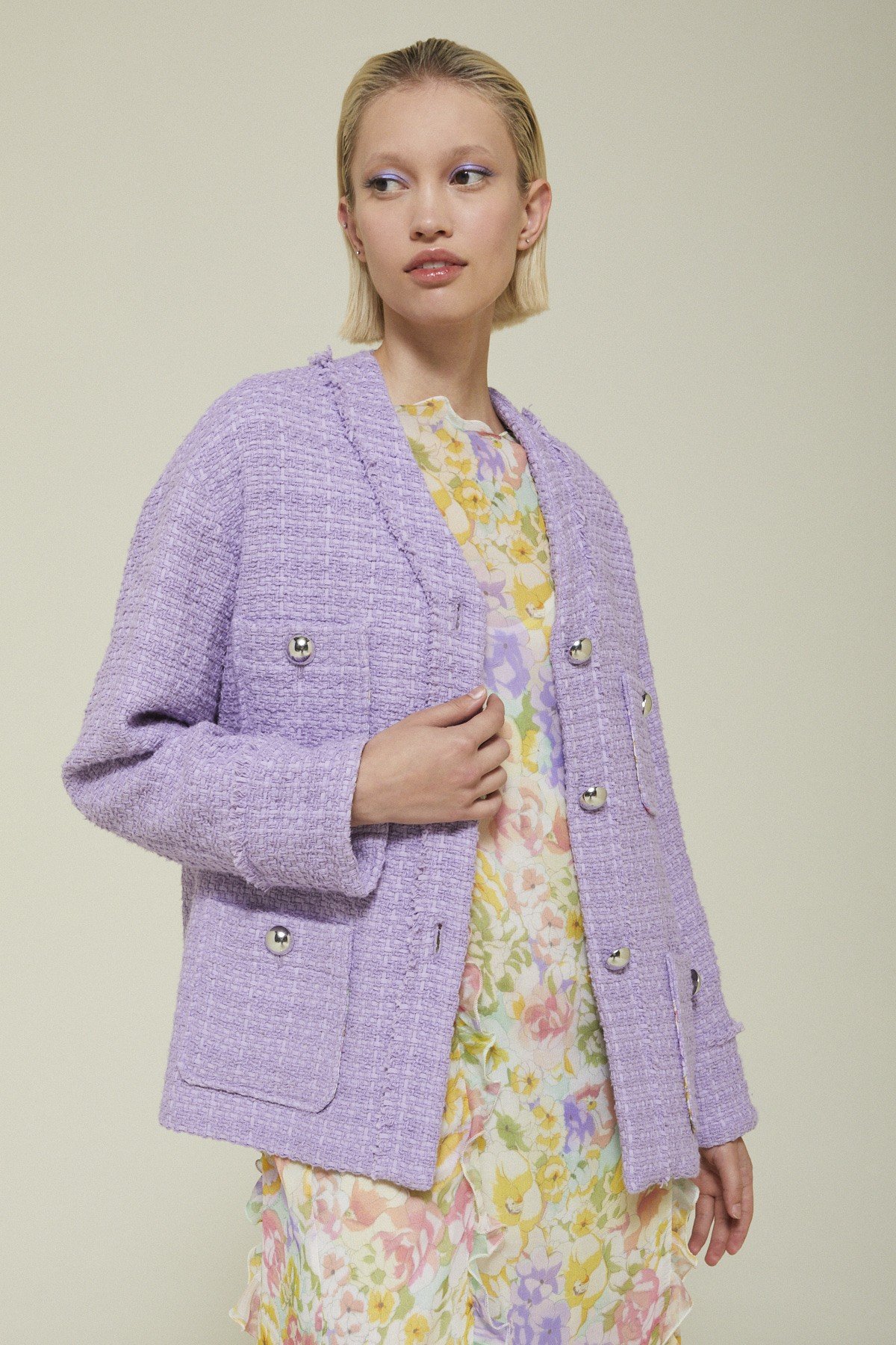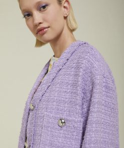 Tweed jacket with patch pockets and buttons.