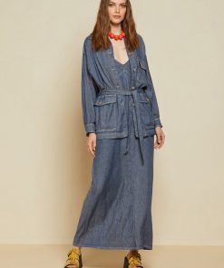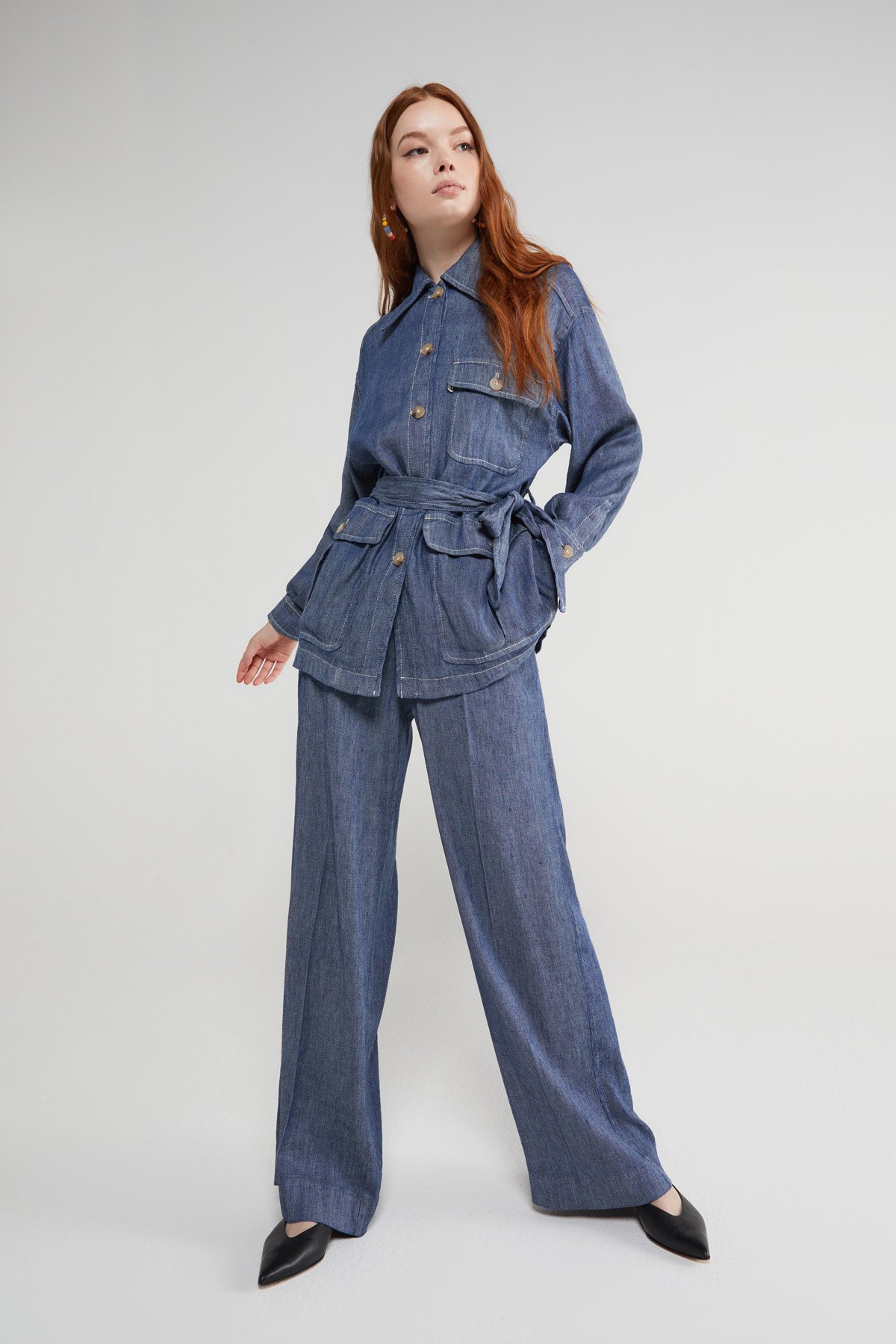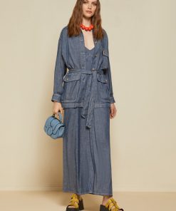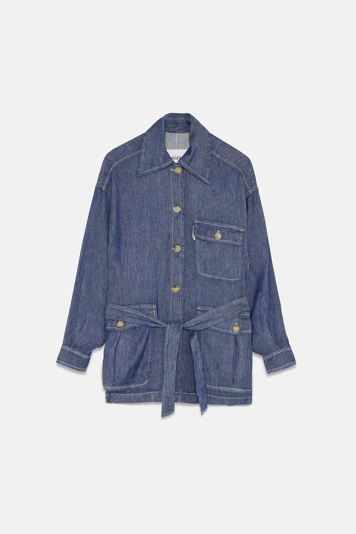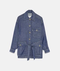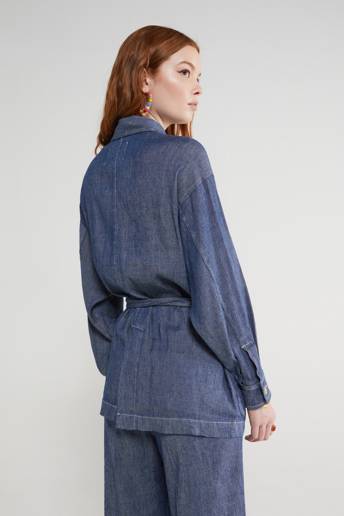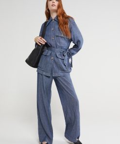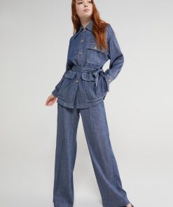 Linen blend jacket, denim effect, with sash and pockets