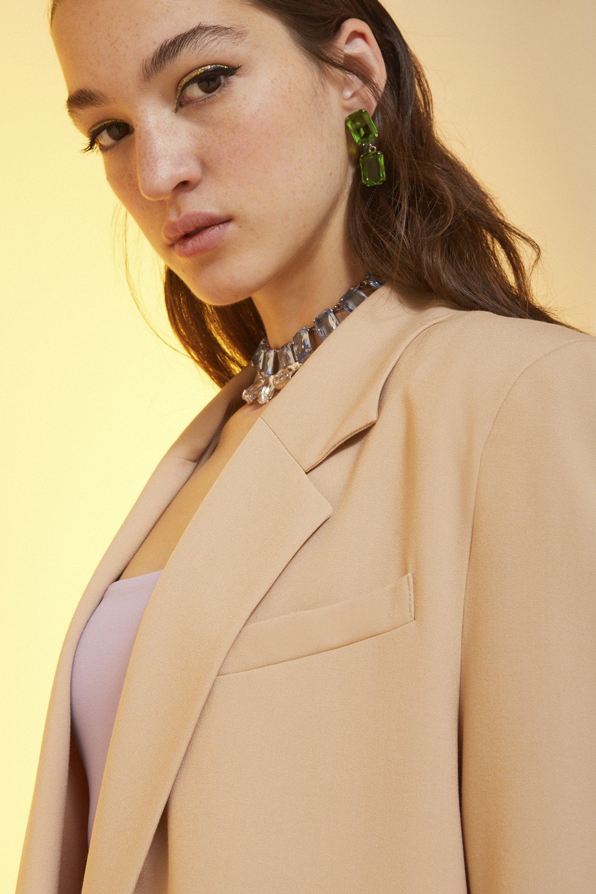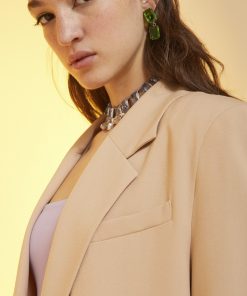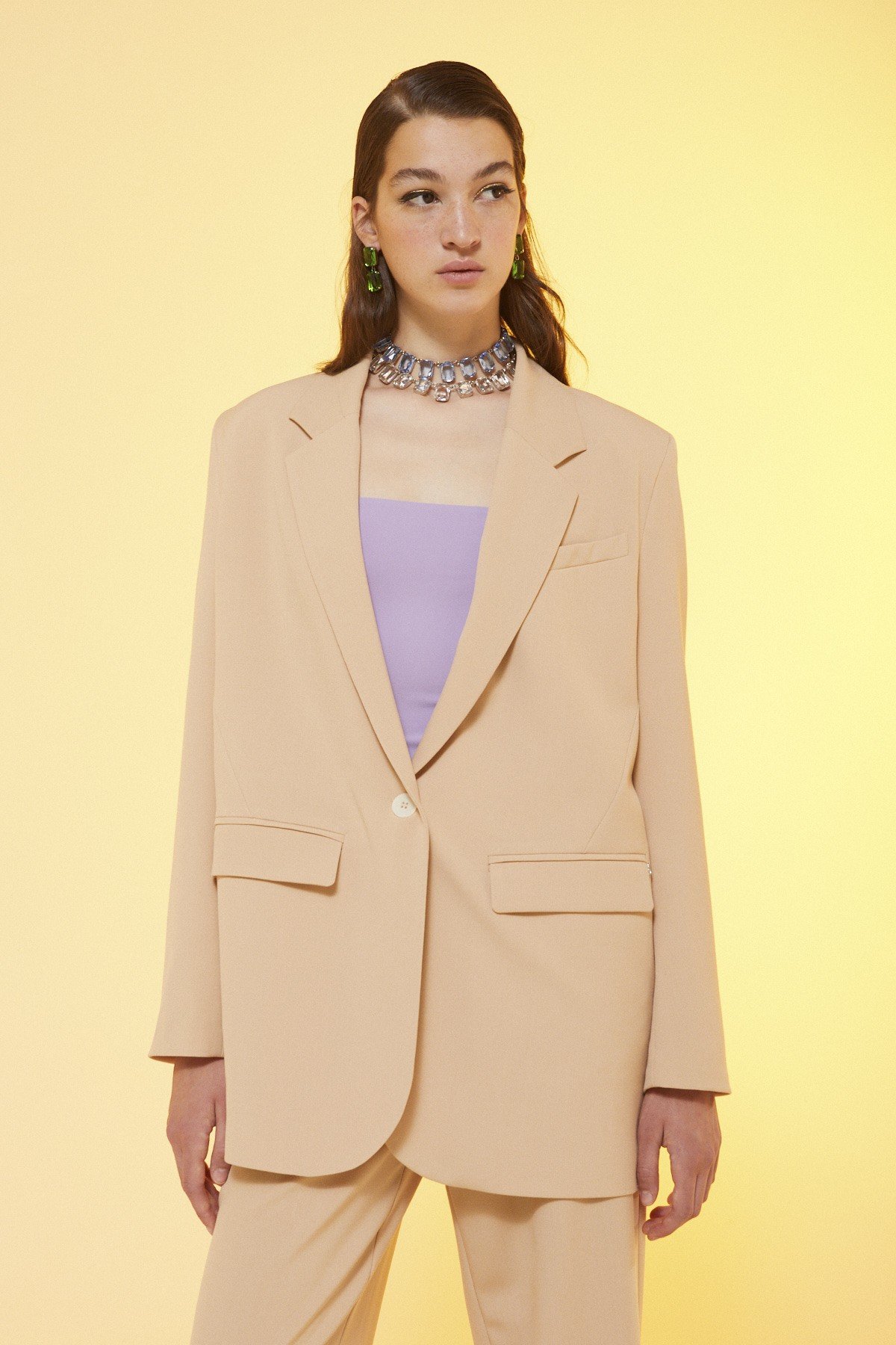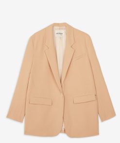 One-button jacket with pockets.
