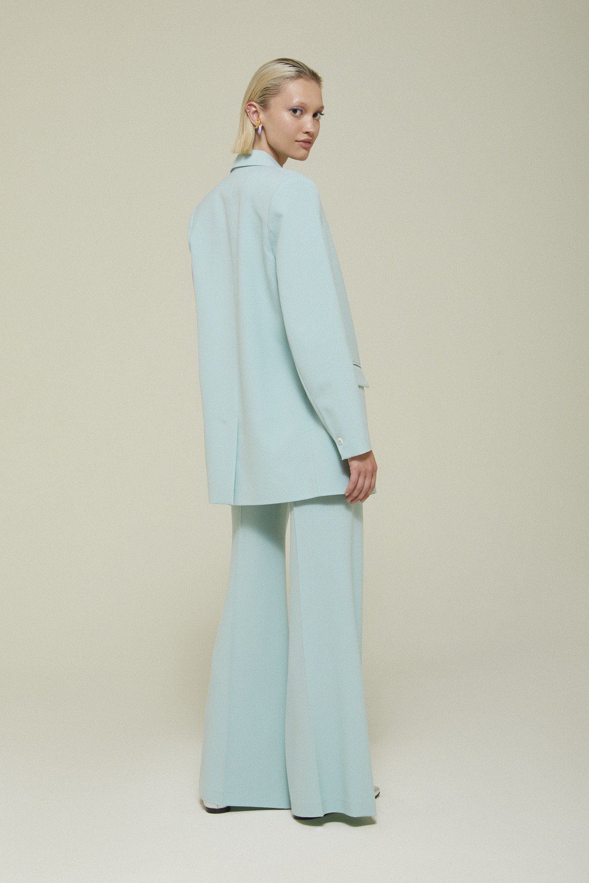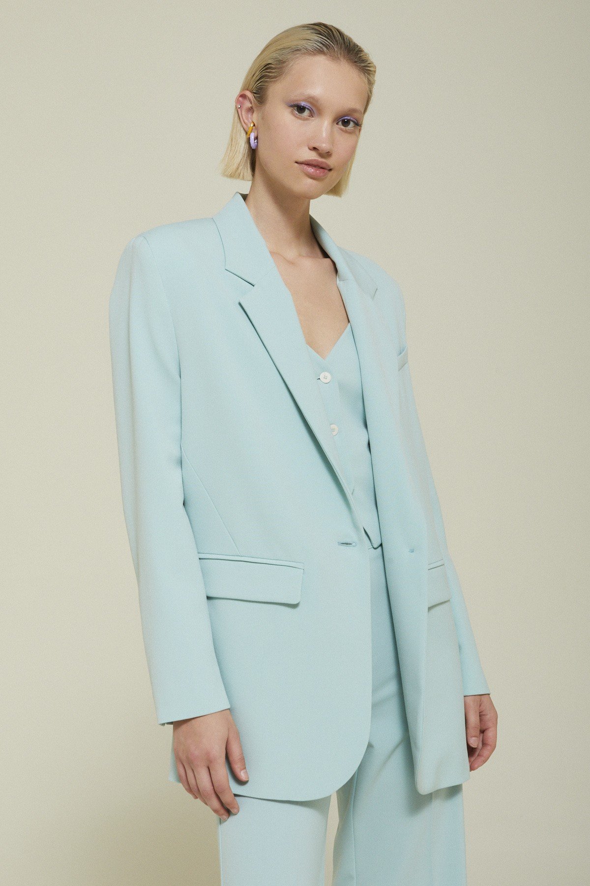 One-button jacket with pockets.