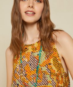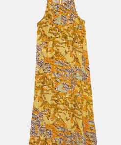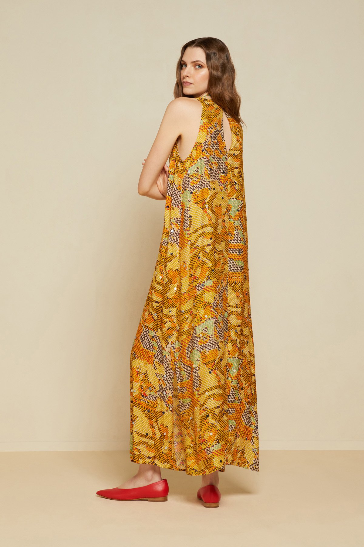 Printed viscose long dress with keyhole back opening and slits at the hem