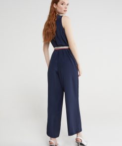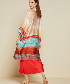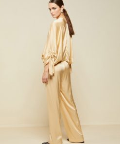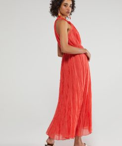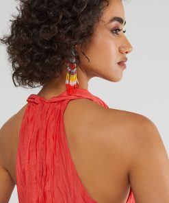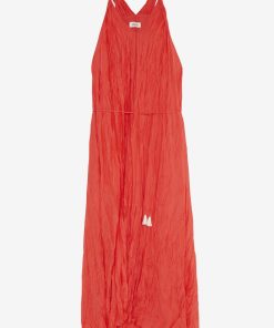 Silk blend cotton long dress with deep V neckline and belt with tassels
